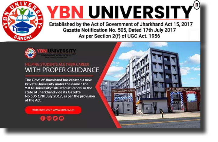 The Govt. of Jharkhand has created a new Private University under the name "The Y.B.N University" situated at Ranchi in the state of Jharkhand vide its Gazette No.505 17th July'2017, as per the provision of the Act.